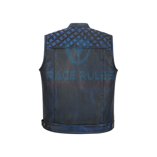 Men’s Blue Black Leather Motorcycle Club Vest – Quilted Shoulder Design