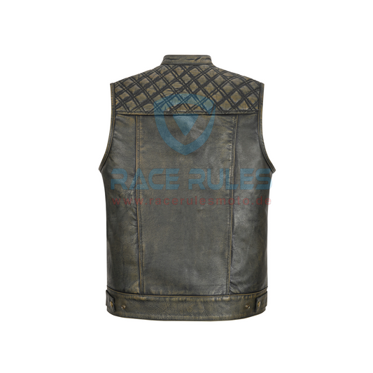 Men’s Distressed Olive Black Leather Motorcycle Vest – Quilted Shoulders & Chronic Shade Finish