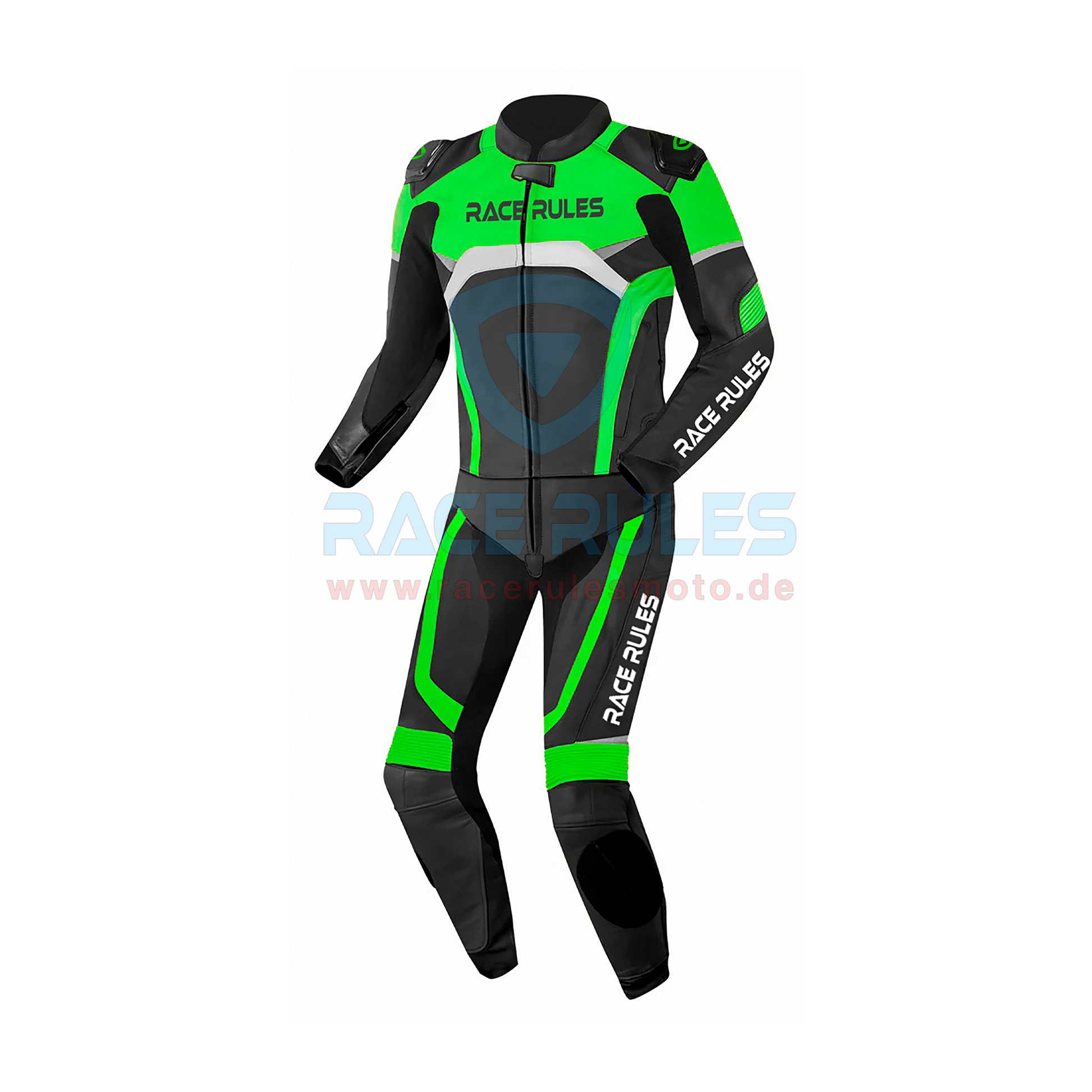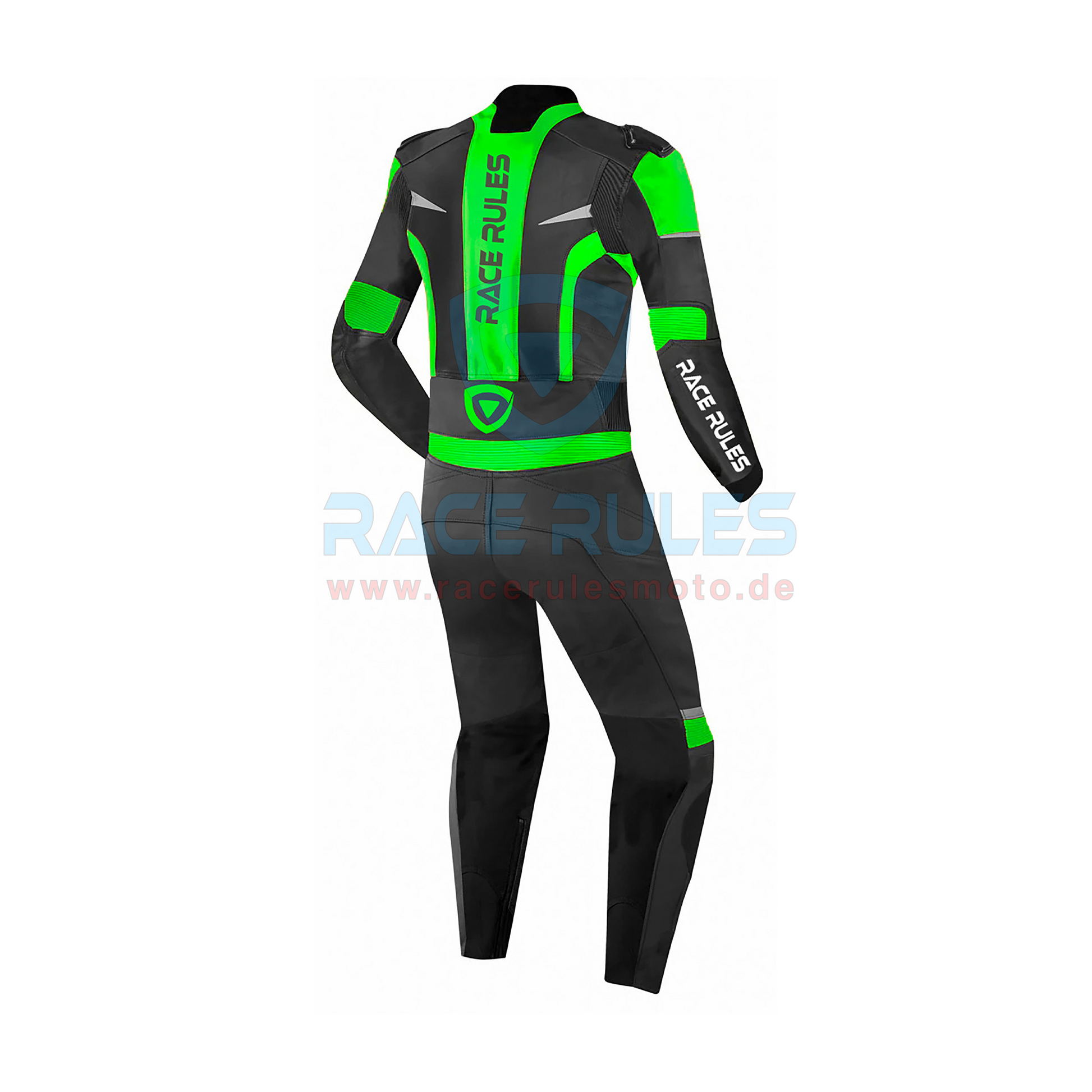 RaceRules Men’s Motorcycle Racing Leather Suit – Black Green Track Riding Gear with CE Armor & Sliders